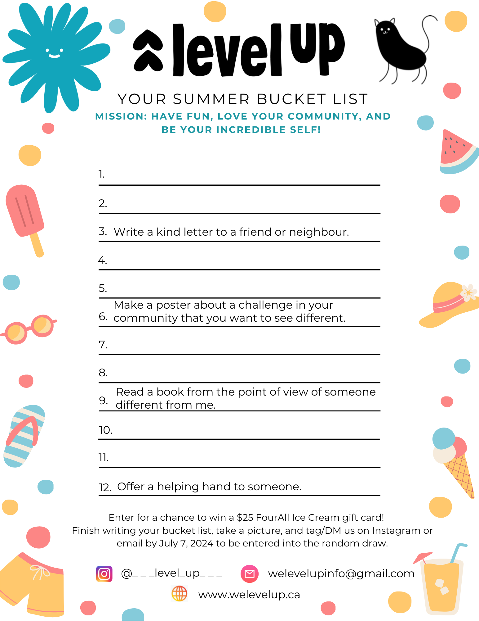 Enter for a chance to win a $25 FourAll Ice Cream gift card. Download the summer bucket list by clicking on the image or the button below. Fill in your bucket list with your own ideas. When you finish writing your bucket list, take a picture of it and share it with us by email or tag/DM us on Instagram by July 7, 2024 to be entered into a random draw!